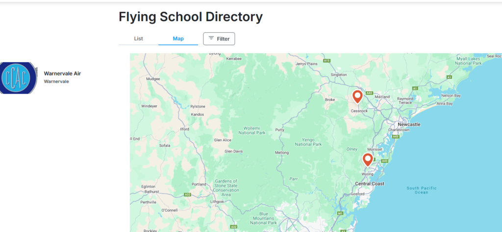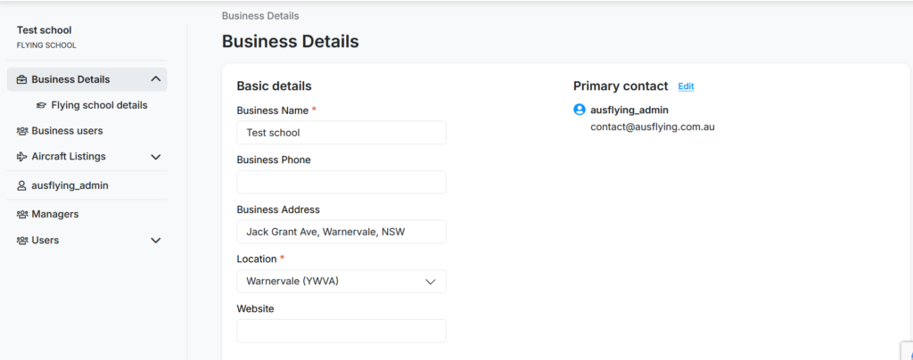 The LOCATION field on the business details is where your flying school will be filtered on the search. For example, if a user does a search for “Sydney”.