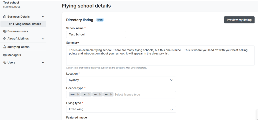 Next, click on Flying School Details and fill the data in. At the bottom, you can choose to save as DRAFT or PUBLISHED. make sure you save it before trying to preview, and after any changes.